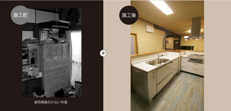 東区青葉のU様邸では、使用していない和室を含め、3部屋を繋いで24帖の広々リビングを作り、ホームシアタースペースを実現。休日や夕食後のひとときに映画鑑賞を楽しむなど、家でちょっと贅沢な気分を楽しむプランにいたしました。大工手作りのバーカウンターも見どころのひとつです。