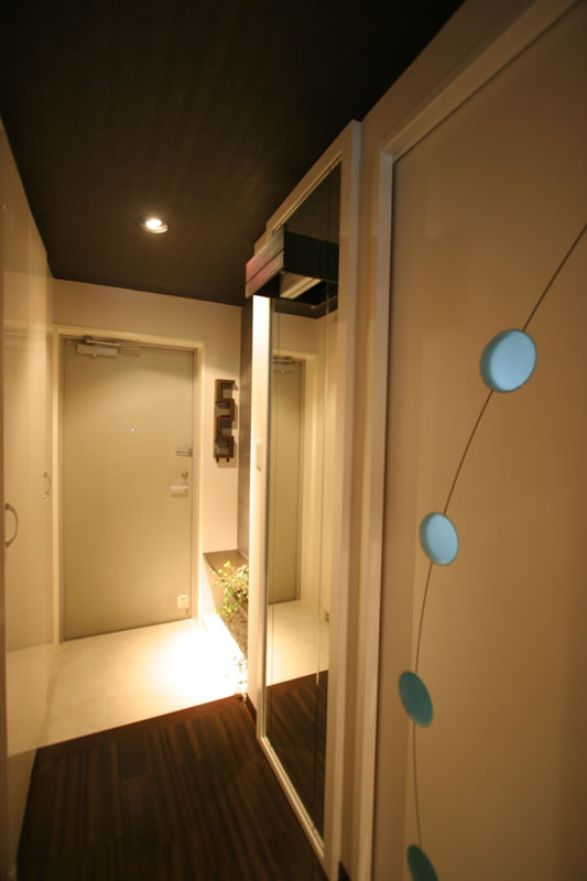 | 明るいイメージだが、照明が効果的でなく冷たい印象の玄関ホール。 | 再利用の照明器具で間接照明を。空間に奥行きを感じます。 |