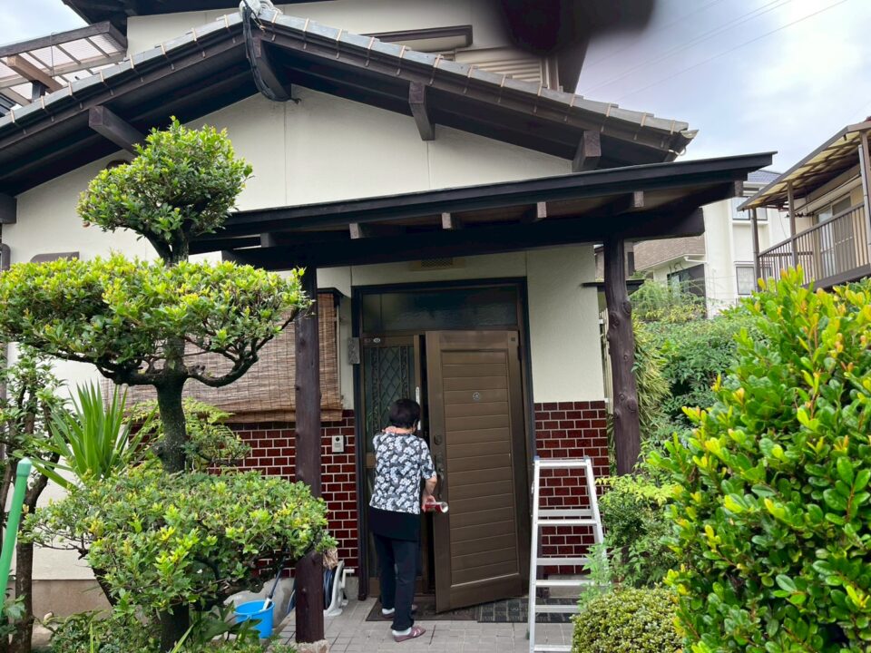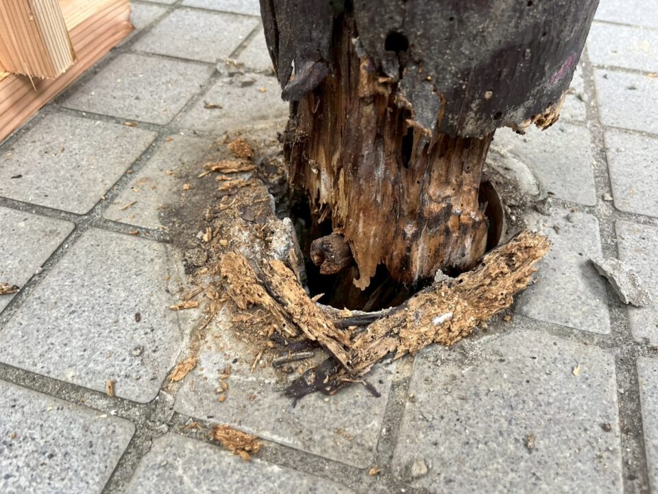 既存玄関の木製柱が腐食していた為、取替工事をさせて頂きました。